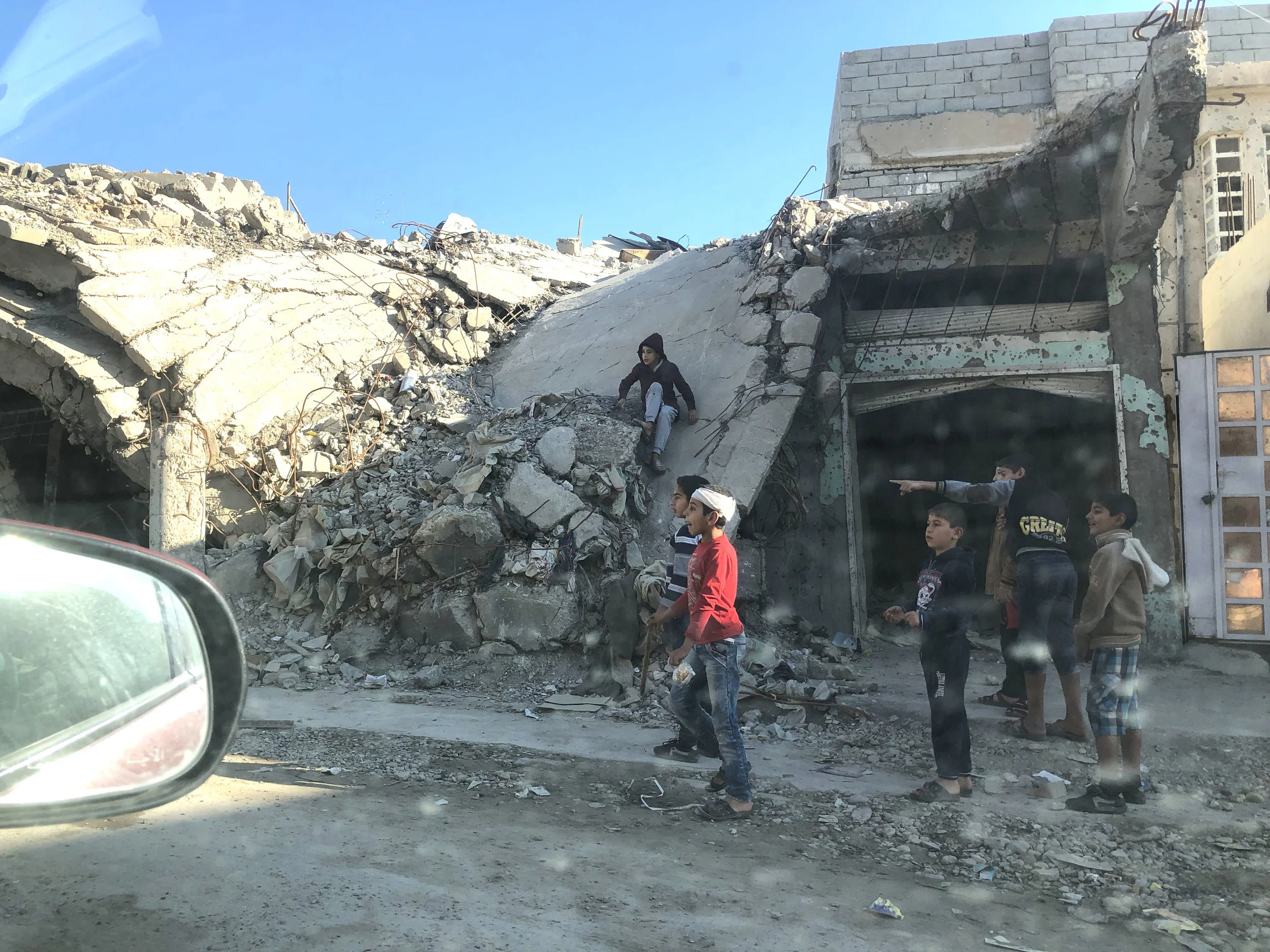 Children playing on rubble in western Mosul, as seen from the passenger seat of my translator’s car. November, 2018. (Rebecca Gibian)