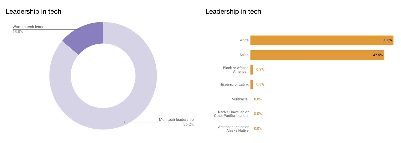 For the first time, Uber included intersectional data in the diversity report it released in July, and it’s not a pretty picture, particularly at the top: Women overall hold under 14 percent of leadership roles in tech, while black and Latinx women have, oh, around 0 percent of those jobs, the report showed. Repeat: Zero, zilch, none. Across all divisions, men hold 72 percent of leadership roles.